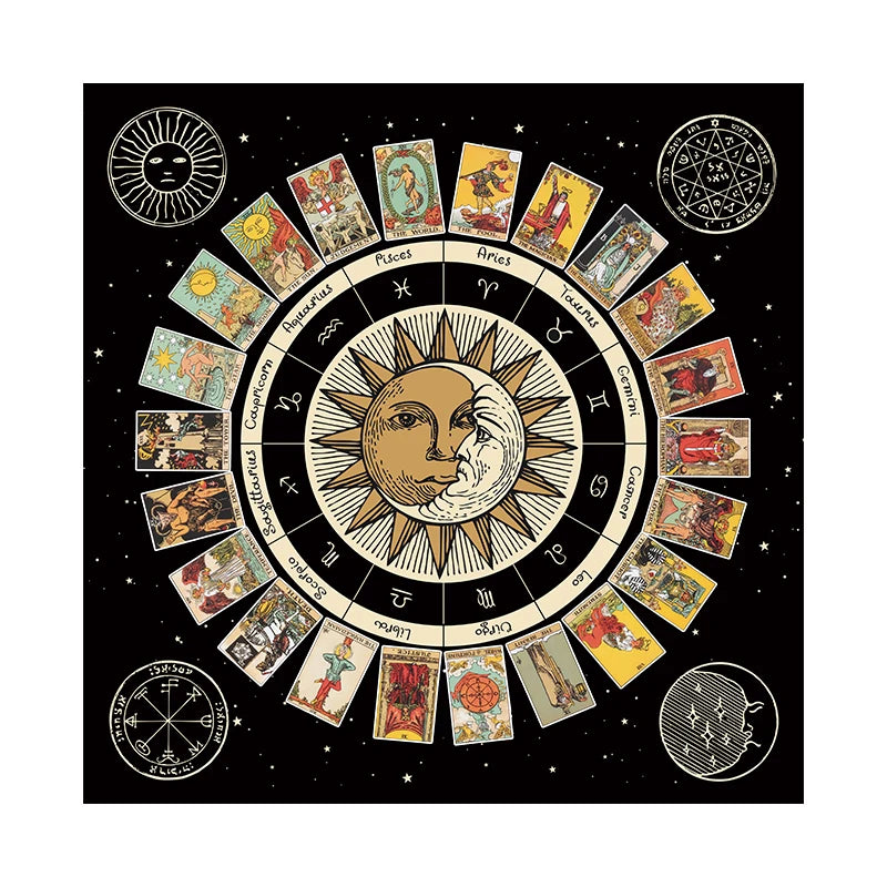 Elevate your spiritual space with our Tarot Card Tablecloth Altar Cloth. Featuring the Wheel of the Zodiac and an Astrology Chart, this mystical cloth is perfect for your altar or sacred space. Crafted with premium materials, it's ideal for Oracle Cards and will enhance any room or home decor with its Sun and Moon witchcraft vibes.